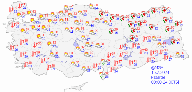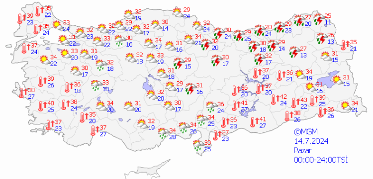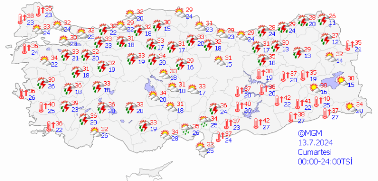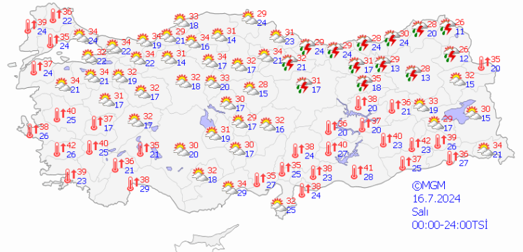 Şanlıurfa, 42°C: Az bulutlu ve açık. Parçalı, yer yer çok bulutlu, öğle saatlerinden sonra yerel sağanak ve gök gürültülü sağanak yağışlı.