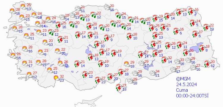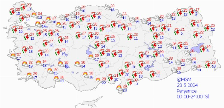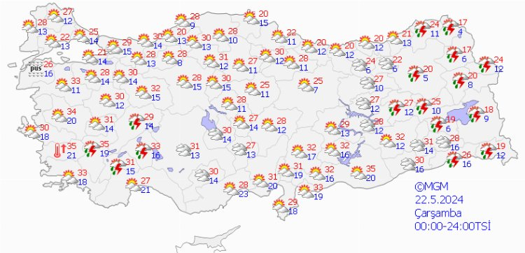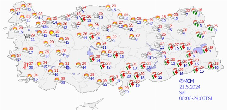 Meteoroloji Genel Müdürlüğü tarafından yapılan son değerlendirmelere göre: Yurt genelinin parçalı yer yer çok bulutlu, Akdeniz’in iç kesimleri, İç Anadolu’nun güneyi ile Afyonkarahisar, Ankara, Çankırı, Kars, Ardahan, Bitlis, Van, Hakkari, Gaziantep ve Kilis çevrelerinin yerel sağanak ve gök gürültülü sağanak yağışlı geçeceği tahmin ediliyor.