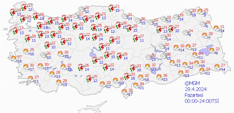 Parçalı ve az bulutlu zamanla çok bulutlu gece saatlerinden sonra sağanak ve gök gürültülü sağanak yağışlı