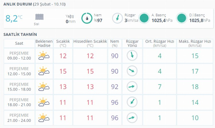 Saatlik tahminlere göre, gün boyunca hava koşulları değişkenlik gösterecek. Sabah saatlerinde, 09.00 ile 12.00 arasında, parçalı bulutlu bir hava bekleniyor. Sıcaklık 12°C olarak tahmin edilirken, hissedilen sıcaklık da aynı seviyede olacak. Nem oranı %90 olarak ölçülürken, rüzgar hızı 4 km/sa olacak.