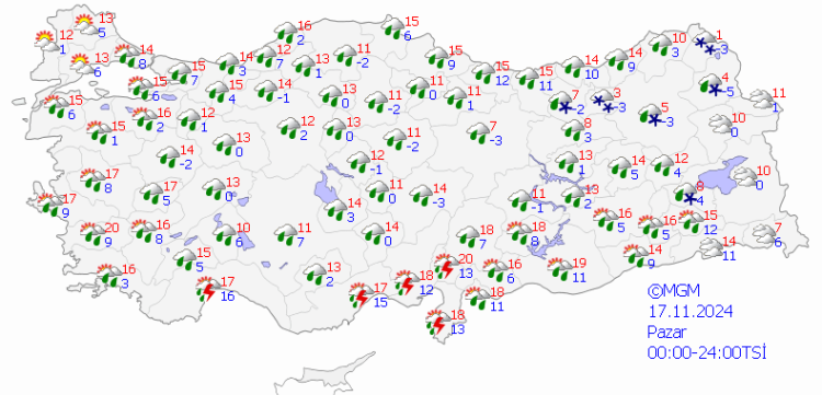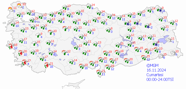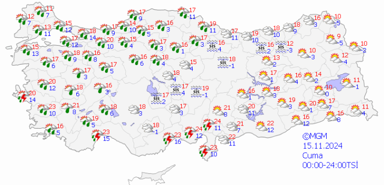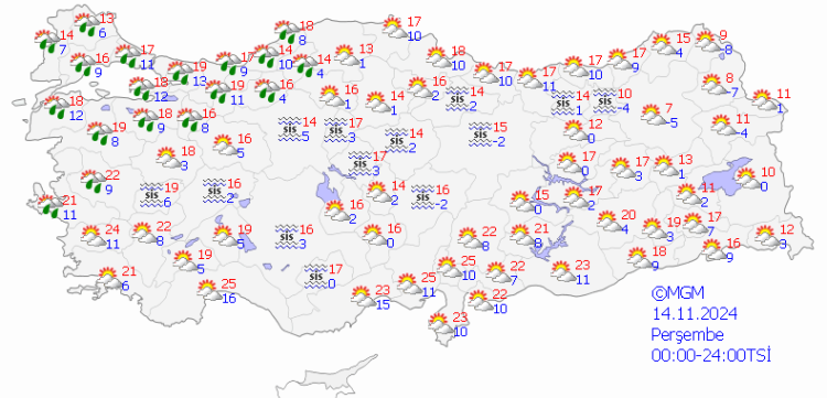 MGM tarafından yapılan tahminlere göre yağışların; genellikle yağmur ve sağanak, Van ve Hakkari çevrelerinin yükseklerinde karla karışık yağmur ve kar yağışı şeklinde görülmesi bekleniyor. Yurdumuzun iç kesimlerinde pus ve yer yer sis görülmesi bekleniyor.