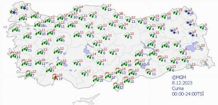 Aralık ayının gelmesiyle Türkiye yağışlı havaya teslim oldu. Ülke genelinde etkisini gösteren yoğun sağanak yağışlar yer yer karla karışık yağmur şeklinde görülüyor. Meteoroloji Genel Müdürlüğü 14 il için sarı ve turuncu kodlu uyarı da bulunurken sel ve su baskınlarına karşı tedbirli olunması konusunda uyardı.