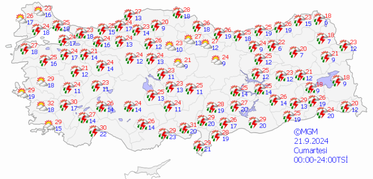 Ülkemiz genelinin parçalı ve çok bulutlu, Marmara’nın kuzey ve doğusu, Akdeniz'in Toroslar kesimi ile Doğu Akdeniz, İç Anadolu'nun kuzey ve doğusu, Karadeniz Bölge geneli ile Doğu ve Güneydoğu Anadolu'nun kuzey ve doğusunun sağanak ve gök gürültülü sağanak yağışlı geçeceği tahmin ediliyor. Yağışların; Doğu Karadeniz kıyıları, Kırklareli ve Ordu çevreleri ile İstanbul Avrupa yakasının Karadeniz kıyılarında yer yer kuvvetli, Rize ve Artvin çevrelerinde çok kuvvetli olması bekleniyor.
