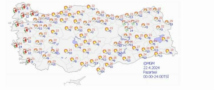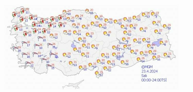 Meteoroloji Genel Müdürlüğü tarafından yapılan son değerlendirmelerde yer alan bilgilere göre; Türkiye’nin kuzey ve batı kesimlerinin parçalı yer yer çok bulutlu bir hava beklenirken, Marmara’nın batısı, Kıyı Ege, Ordu, Giresun, Trabzon ve Rize illerinin iç ve yüksek kesimleri, Manisa ve Antalya’nın kuzeybatısı ile gece saatlerinden itibaren Balıkesir, Bursa ve Yalova çevrelerinin yerel olmak üzere sağanak ve yer yer gök gürültülü sağanak yağışlı geçmesi bekleniyor.