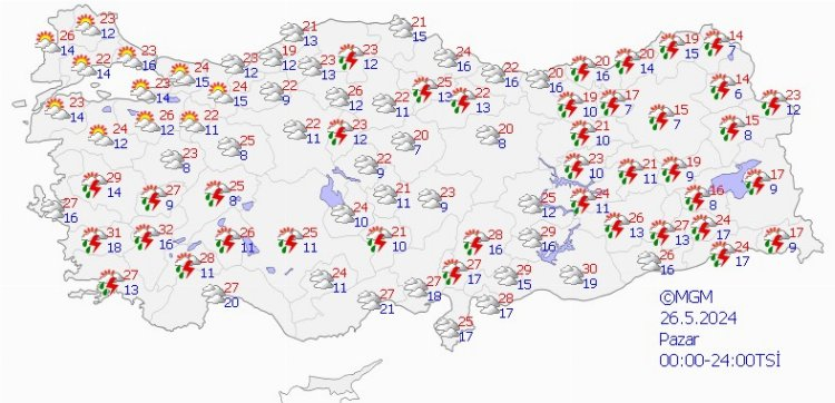 Yurt genelinin parçalı yer yer çok bulutlu, İç Ege, Batı Akdeniz’in iç kesimleri, Doğu Anadolu’nun doğusu, Kocaeli, Yalova, Sakarya, Konya, Karaman, Aksaray, Niğde, Eskişehir, Bolu ve Düzce çevreleri, Ankara’nın güney kesimleri ile Doğu Akdeniz’in Toroslar kesiminin yerel olmak üzere sağanak ve gök gürültülü sağanak yağışlı geçmesi bekleniyor.