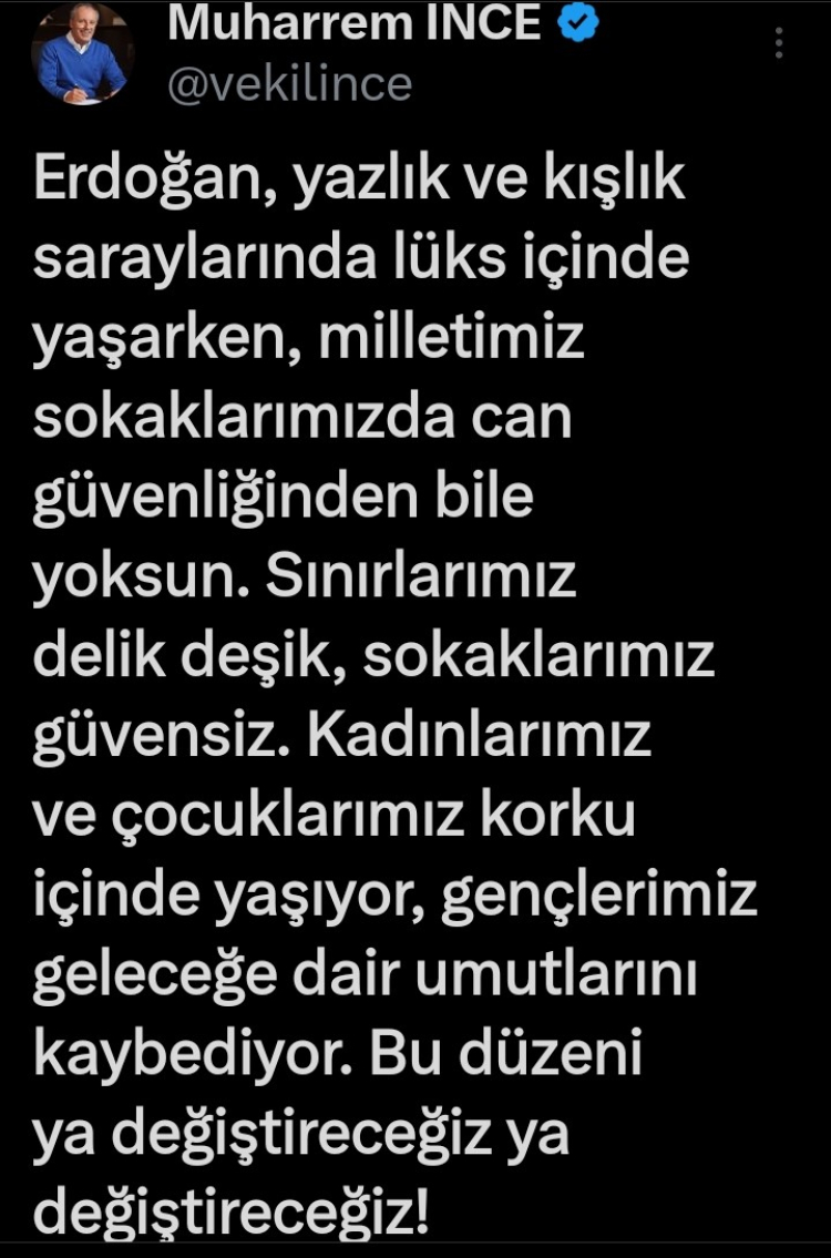 İnce, dünya genelinde aktif olarak kullanılan sosyal medya kanalı X (eski adı Twitter) üzerinden yapmış olduğu paylaşımda şu ifadelere yer verdi: “Erdoğan, yazlık ve kışlık saraylarında lüks içinde yaşarken, milletimiz sokaklarımızda can güvenliğinden bile yoksun. Sınırlarımız delik deşik, sokaklarımız güvensiz. Kadınlarımız ve çocuklarımız korku içinde yaşıyor, gençlerimiz geleceğe dair umutlarını kaybediyor. Bu düzeni ya değiştireceğiz ya değiştireceğiz!”