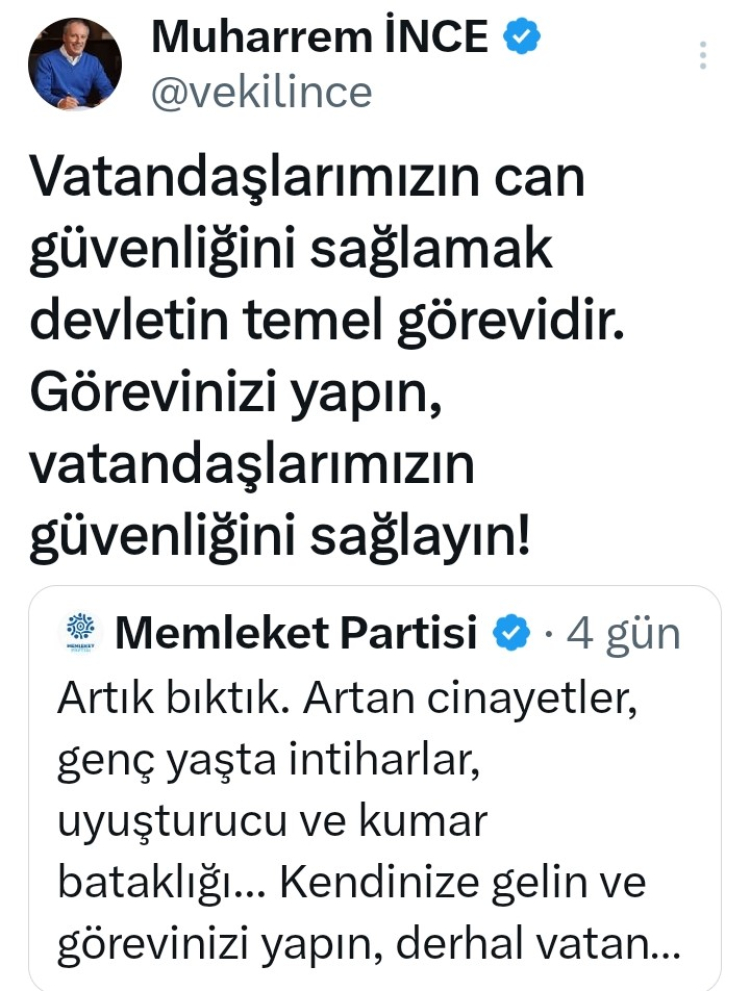 Diğer yandan Muharrem İnce, X üzerinden yapmış olduğu bir önceki paylaşımda da şu ifadeleri kullandı: “Vatandaşlarımızın can güvenliğini sağlamak devletin temel görevidir. Görevinizi yapın, vatandaşlarımızın güvenliğini sağlayın.”
