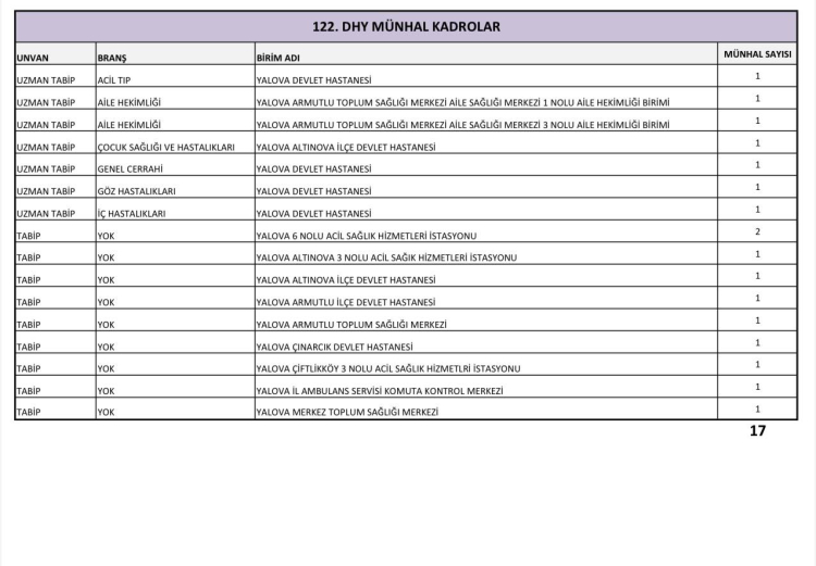 Yalova Altınova İlçe Devlet Hastanesi'nde görev yapmak üzere 1 adet Tabip.