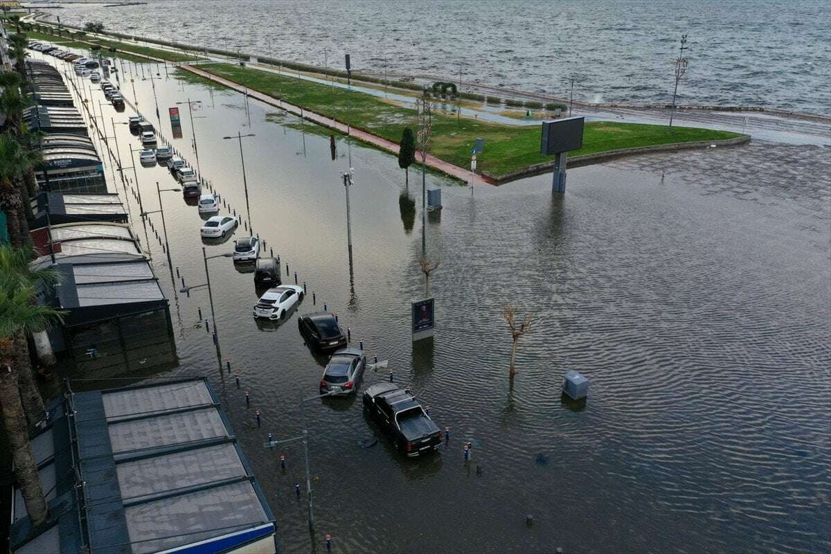 İzmir’e fırtınanın etkisiyle deniz taşarken pek çok ilde ve ilçede fırtına nedeniyle çatılar uçarken sağanak yağışta sellere neden oldu.