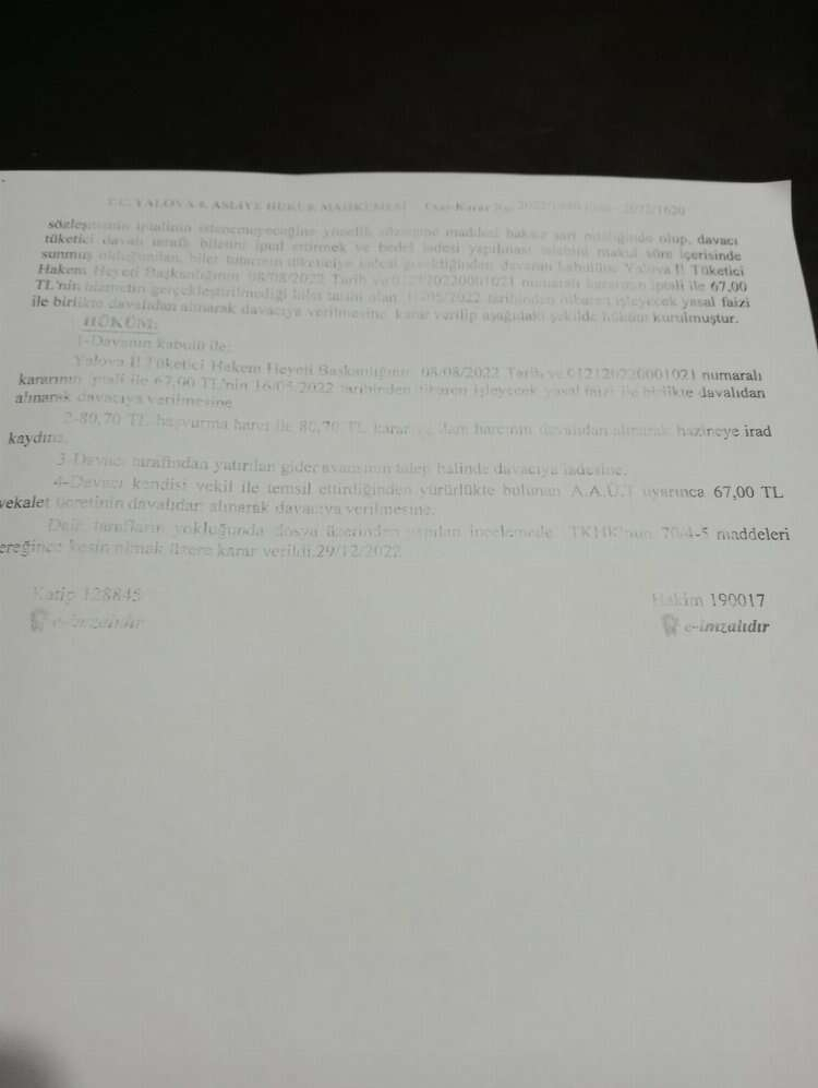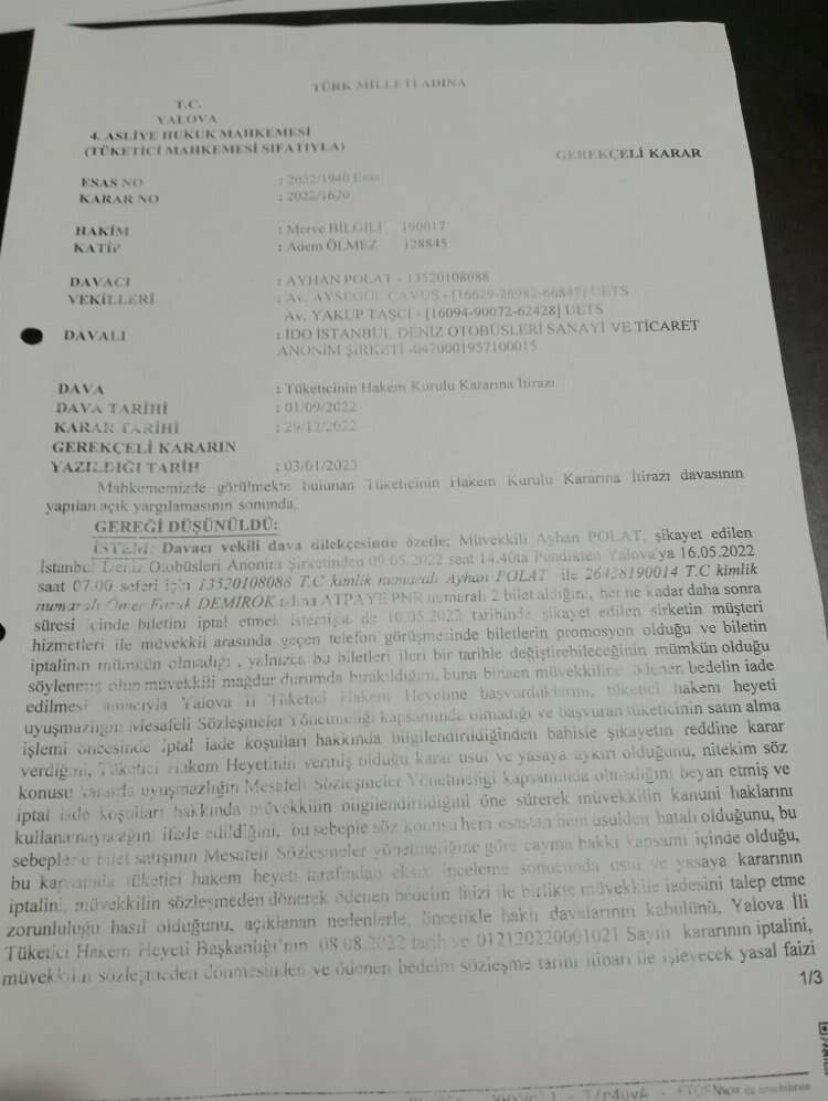 Ayrıca mahkeme kararında şu hükümlere yer verildi; “Davanın kabulü ile; Yalova İl Tüketici Hakem Heyeti Başkanlığının 08.08.2022 tarih ve 012120220001021 numaralı kararının iptali ile 67.00 TL’nin hizmetin gerçekleştirilemediği bilet tarihi olan 16.05.2022 tarihinden itibaren, işleyecek yasal faizi ile birlikte davalı İstanbul Deniz Otobüsleri Sanayi ve Ticaret Anonim Şirketi (İDO)’dan alınarak, davacı Ayhan Polat’a verilmesine, 80,70 TL başvurma harcı ile 80,70 TL karar ve ilam harcının davalıdan alınarak hazineye irad kaydına, davacı tarafından yatırılan gider avansına talep halinde davacıya iadesine, davacı kendisi vekil ile temsil ettirdiğinden yürürlükte bulunan A.A.Ü.T. uyarınca 67.00 TL vekalet ücretinin davalıdan alınarak davacıya verilmesine. Dair tarafların yokluğunda dosya üzerinden yapılan incelemede TKHK’nın 70/4-5 maddeleri gereğince kesin olmak üzere karar verildi.”