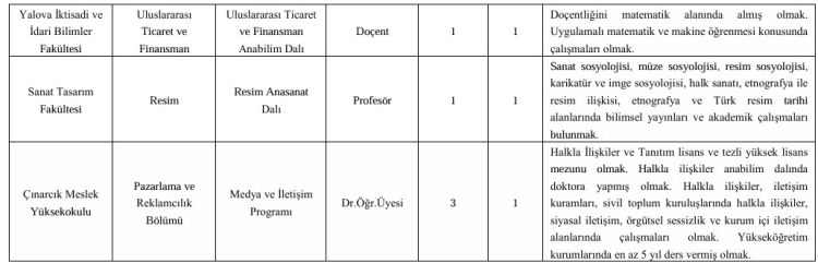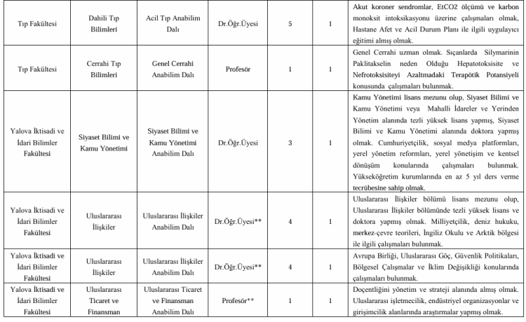 Yalova Üniversitesi’nden yapılan açıklamada “Üniversitemizin aşağıda belirtilen kadrolarına 2547 sayılı Yükseköğretim Kanunu, Öğretim Üyeliğine Yükseltilme ve Atanma Yönetmeliği ve Üniversitemiz Senatosu’nca belirlenerek Yükseköğretim Kurulu Başkanlığı tarafından onaylanan Akademik Atama ve Yükseltme Kriterleri uyarınca öğretim üyeleri alınacaktır” denildi. İlanda üniversitenin farklı fakültelerine 15 öğretim üyesi alınacağı açıklandı.
