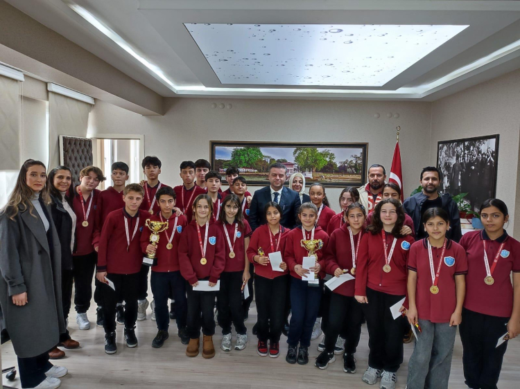 Yalova’daki turnuvalarda şampiyon olan Şehit Talha Bahadır Ortaokulu’nun spor takımları, İl Milli Eğitim Müdürü Halil İbrahim Akmeşe’yi ziyaret ederek sevinçlerini paylaştı. Akmeşe, akademik alanda olduğu kadar spor alanında başarılı olunmasını da çok önemsediklerini ifade etti.