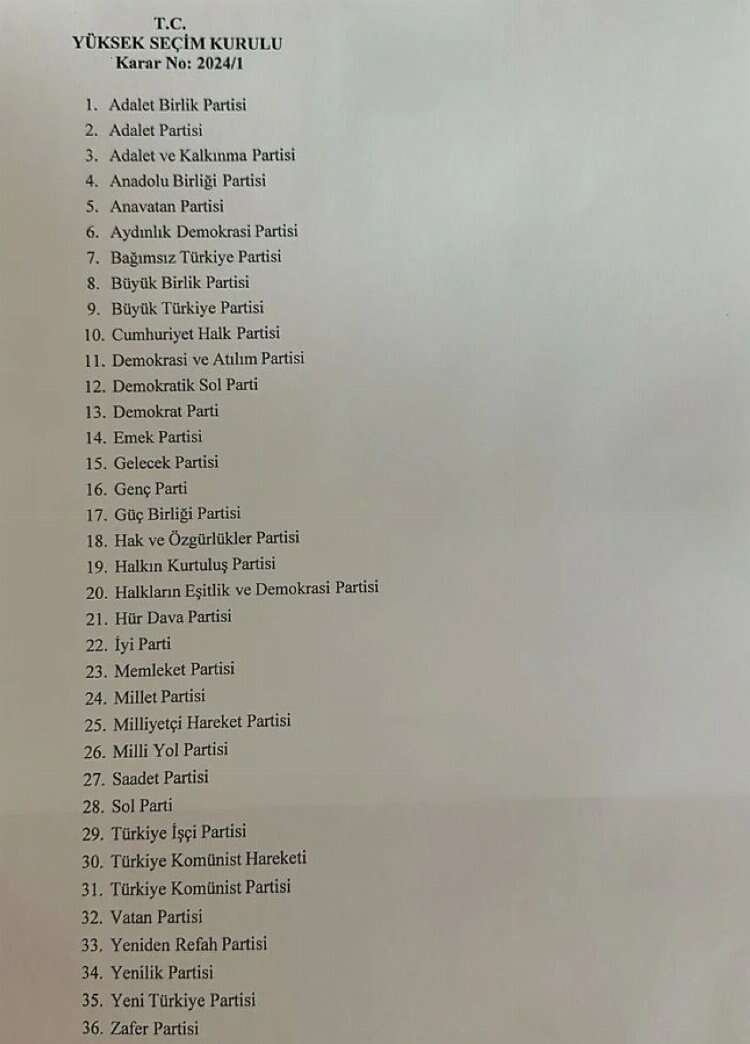 2024 yılının başlamasıyla birlikte Türkiye yerel seçim atmosferine girdi. Bu hafta birçok adayın açıklanması beklenirken Yüksek Seçim Kurulu Başkanı Ahmet Yener seçimlere katılabilme yeterliliği olan 36 partiyi açıkladı.