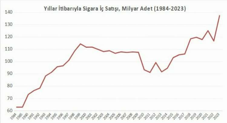 Tarım ve Orman Bakanlığı'na bağlı Tütün ve Alkol Dairesi Başkanlığı tarafından paylaşılan verilere göre, Türkiye'de sigara satışları 2023 yılında 2022 yılına göre yüzde 17,7 artışla 137,4 milyar adete ulaşarak tüm zamanların zirvesine ulaştı ve dünyada rekor kırdı.