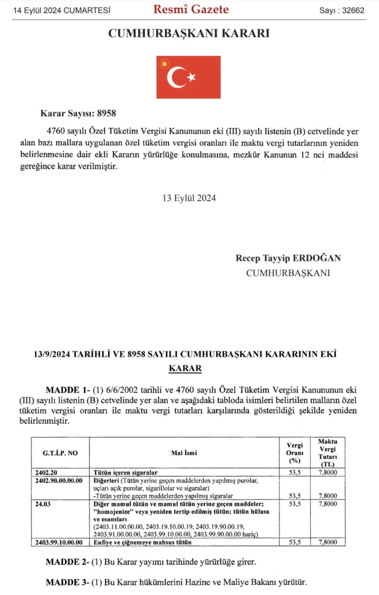 Karar hükümlerini uygulayıcı olarak Hazine ve Maliye Bakanı yürütecek. Bakanlıktan edinilen bilgilere göre, sigaranın enflasyon üzerindeki baskısını azaltmak amacıyla sigara üzerinden alınan nispi vergide düşüş yapılırken, maktu vergide artış gerçekleşti.