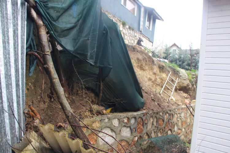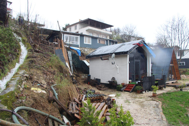 Toprak kaymasının doğal nedenlerden ziyade insan eliyle yapılan hatalardan kaynaklandığını savunan Gonca Tuna, evin alt tarafındaki araziye yerleştirilen 2 adet bungalov ev için yapılan kazı çalışmasına dikkat çekti. Yamaçta yapılan bu kazının zemini zayıflattığını belirten Tuna, "Evimizin alt tarafında yer alan bungalovların yerleştirilmesi esnasında yapılan tedbirsiz kazı bu olaya neden oldu. Daha önce sahiplerine buraya bir istinat duvarı yapmaları gerektiğini defalarca belirttik ancak her seferinde olumsuz yanıt aldık. Şimdi toprağımız kaydı, evimiz askıda kaldı. Engelli oğlumla ne yapacağımızı bilemiyoruz, gidecek hiçbir yerimiz yok ve şu an sokakta kaldık." dedi.