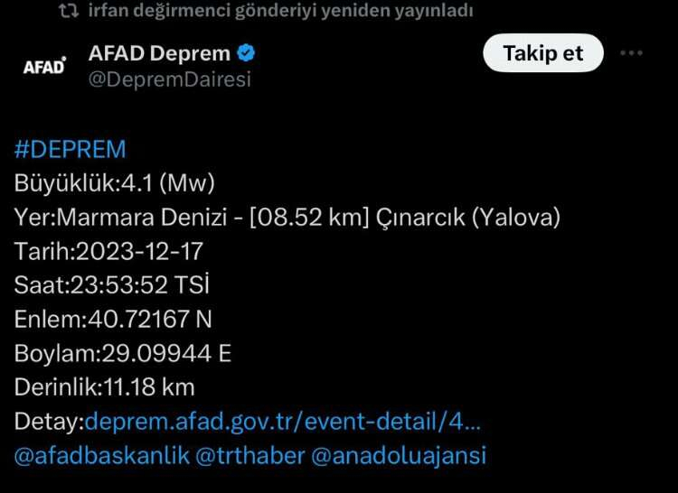 AFAD'dan son dakika deprem açıklaması geldi. Marmara'da saat 23.53'te 4,1 büyüklüğünde deprem meydana geldi. Deprem İstanbul ve çevre illerde de hissedildi.