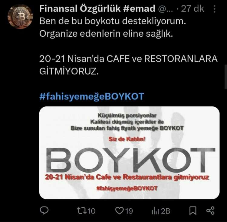 Özellikle dar gelirli vatandaşlar dışarıdaki kafe, restoran, pastane gibi işletmelerin yaptıkları fahiş zamlara fazlasıyla tepki gösterirken, bu gidişat bir yeni hareketi de beraberinde getirdi. Sosyal medya platformu X üzerinde fahiş fiyatlara ilişkin yaşanan hareketlenme boykotu da beraberinde getirdi. Bu hareketle yurttaşlar 20-21 Nisan tarihlerinde restoran ve kafelere gitmeme kararı aldı.