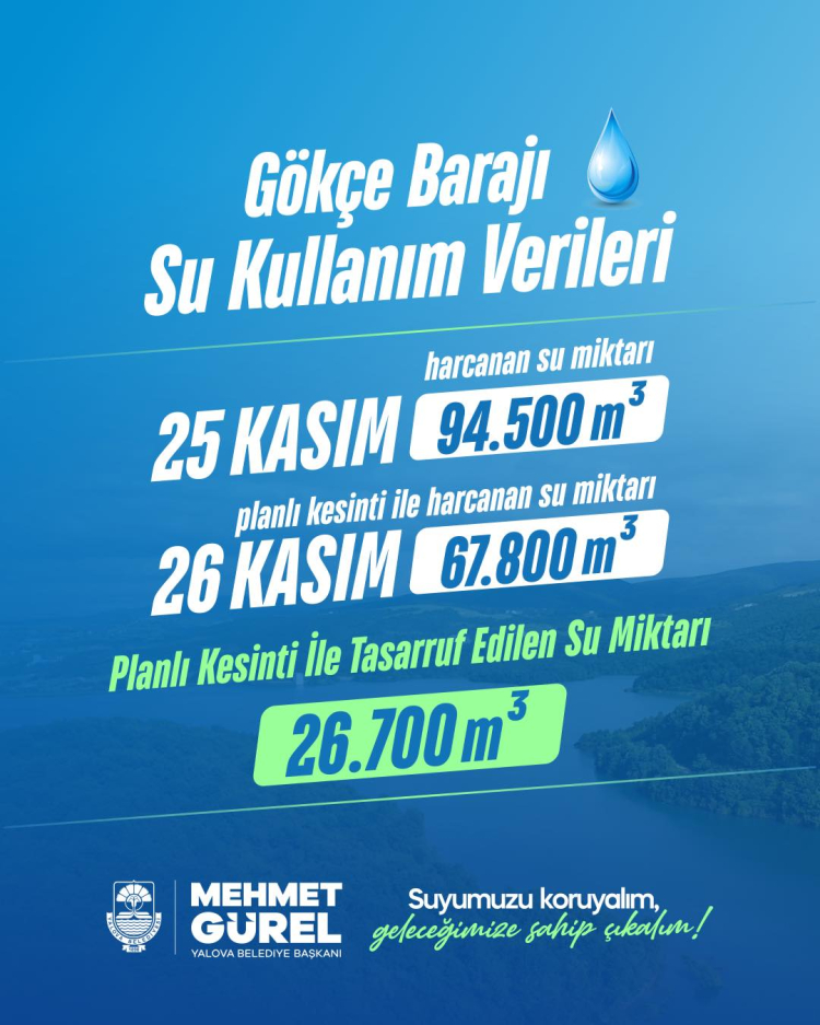 Konuyla ilgili açıklama yapan Yalova Belediye Başkanı Mehmet Gürel, “Yalova Belediyesi olarak su kaynaklarımızı korumak ve sürdürülebilir bir gelecek sağlamak adına başlattığımız Acil Su Eylem Planı ile elde ettiğimiz ilk önemli sonuçları sizlerle paylaşıyoruz. Gökçe Barajı Su Kullanım Verileri kapsamında 25 Kasım’da tüketilen su 94 bin 500 metreküp. 26 Kasım’da planlı kesinti ile tüketim 67 bin 800 metreküp. Toplam tasarruf 26 bin 700 metreküp. Bu süreçte gösterdiğiniz anlayış ve hassasiyet için tüm hemşehrilerimize teşekkür ederiz” sözlerini kullandı.