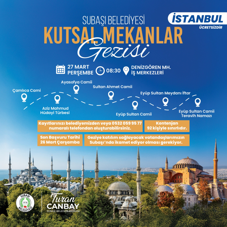 Subaşı Belediye Başkanı Turan Canbay, Subaşı Belediyesi olarak İstanbul Kutsal Mekanlar Gezisi düzenleyeceklerini açıkladı. Kayıtların başladığını açıkladı.
