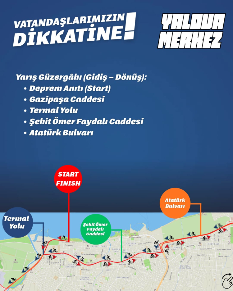 Yalova Valiliği’nden yapılan açıklamada yarış güzergâhı için “Deprem Anıtı- Şehit Ömer Faydalı Cd. – Dörtyol – Çiftlikköy – Tavşanlı – geri dönüş – Şehit Ömer Faydalı Cd. – Çınarcık – Armutlu NATO Yolu – Teşvikiye Kavşağı – geri dönüş – Ortaburun – Termal – Akköy – Fen Lisesi Kavşağı – Samanlı – Çınarlı Yol – Deprem Anıtı” bilgileri verildi.