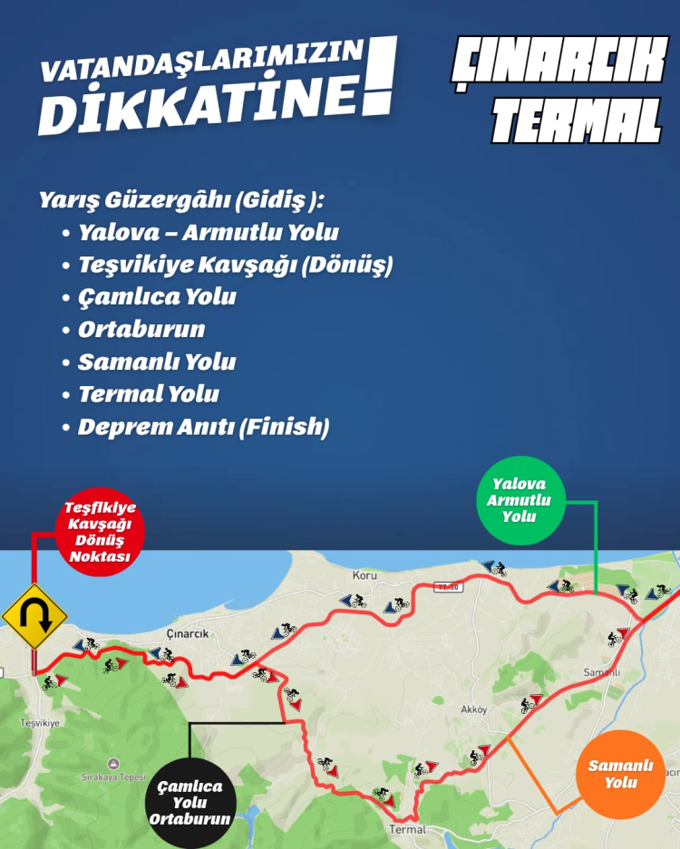 Trafik düzenlemeleriyle ilgili ise “Bölünmüş yollarda, sporcuların kullandığı şerit geçici olarak kapatılacaktır; diğer şerit açık kalacaktır. Bisikletçiler geçtikten sonra yollar kademeli olarak açılacaktır. Çınarcık – Armutlu NATO Yolu’nda her iki yön geçici olarak kapatılacaktır. Trafik, görevli ekiplerce yönlendirilecektir” sözlerine yer verildi.
