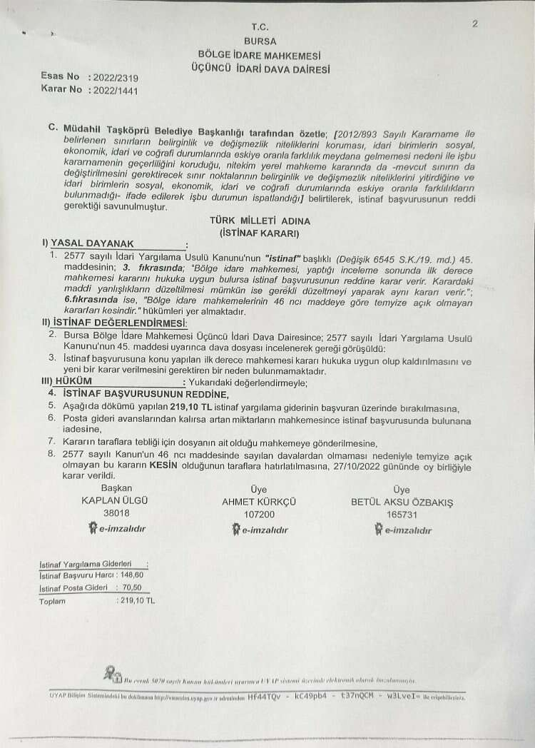 Başkan Aslan, Topçular bölgesinin sınır anlaşmazlığı ile ilgili davanın Bursa 4. İdari Mahkemesi tarafından görüldüğünü, 22 Eylül 2020 tarihinde verilen kararla, Topçular İskelesi ve civardaki parsellerin Taşköprü beldesi sınırları içerisinde kaldığına hükmedildiğini hatırlattı. Aslan, bu kararın daha sonra Tavşanlı Belediyesi tarafından istinaf edildiğini ancak Bursa Bölge İdare Mahkemesi tarafından 27 Ekim 2022 tarihinde onandığını, böylece Topçular ve civarındaki dava konusu parsellerin tamamının Taşköprü Belediyesi sınırları içerisinde kaldığına kesin olarak karar verildiğini bildirdi.