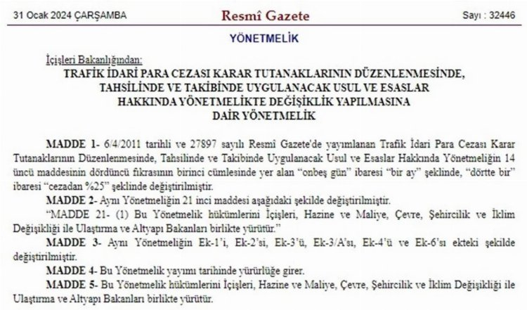 Cumhurbaşkanı Recep Tayyip Erdoğan'ın imzasıyla Resmi Gazete'de yayımlanan yeni karara göre trafik cezalarında indirimli ödeme süresi 15 günden 1 aya çıkarıldı. Kararda ayrıca cezalarda "dörtte bir" ibaresi "cezadan yüzde 25" şeklinde değiştirildi.