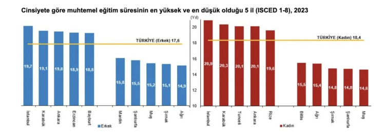Aynı süreçte muhtemel eğitim süresi en düşük olan il 14,9 yıl ile Muş ve Şırnak olurken, bu illeri sırasıyla 15,1 yıl ile Ağrı ve Şanlıurfa, 15,8 yıl ile Mardin takip etti.