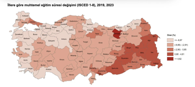 MES'in 2019 ile 2023 yılları arasındaki oranları incelendiğinde en çok artış gösterilen ilk beş il sırasıyla yüzde 8,3 ile Gümüşhane, yüzde 4,6 ile Hakkari, yüzde 2,5 ile Van, yüzde 2,1 ile Diyarbakır ve yüzde 1,7 ile Ağrı oldu. Aynı dönemde, muhtemel eğitim süresinin en çok düşüş gösterdiği illere bakıldığında ise sırasıyla yüzde 10,4 ile Eskişehir, yüzde 10,3 ile Çankırı, yüzde 10,0 ile Yalova, yüzde 9,6 ile Antalya ve yüzde 8,6 ile Muğla oldu.