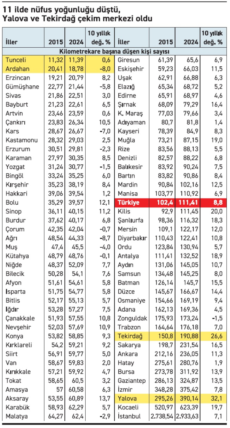 Türkiye’de kilometrekareye düşen nüfus sayısında 2.934 kişiyle ilk sırayı İstanbul alırken, en düşük nüfus yoğunluğuna sahip il 11,4 kişi ile Tunceli oldu. 2015-2024 arasındaki 10 yılda nüfus yoğunluğunun en fazla arttığı iller arasında ilk sırayı ise yüzde 32,1’le Yalova aldı. Bu ili yüzde 26,6 ile Tekirdağ izledi. İstanbul’un nüfus yoğunluğundaki artış da yüzde 7,1 seviyesinde gerçekleşti.