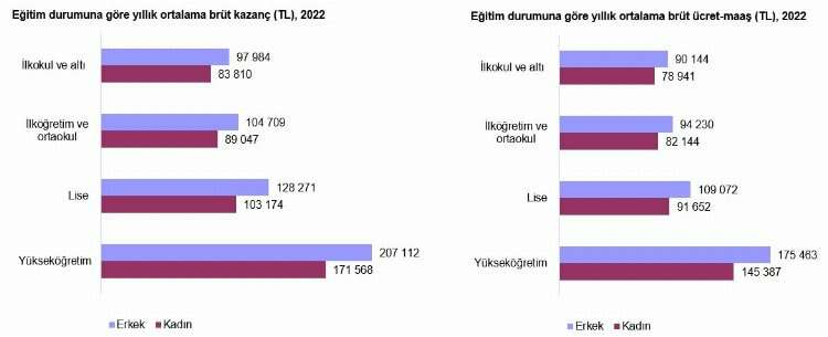 Araştırmaya göre kazanç düzeylerinin hem erkeklerde hem de kadınlarda eğitim durumuna orantılı olarak yükseldiği görüldü. Eğitim durumuna göre değerlendirildiğinde en yüksek yıllık ortalama brüt kazanç yükseköğretim eğitim düzeyine sahip olan kişilerde görüldü. Yükseköğretim düzeyinde yıllık ortalama brüt kazanç erkeklerde 207 bin 112 TL, kadınlarda ise 171 bin 568 TL oldu.