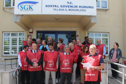 Sosyal Güvenlik Haftası dolayısıyla SGK Yalova İl Müdürlüğü önünde toplanan Türk Büro-Sen’e bağlı kurum çalışanları alınan ‘Kamuda Tasarruf’ tedbirlerine tepki gösterdiler. Burada açıklama yapan Türk Büro-Sen Yalova Şube Başkanı Hacı Ali Kalaycı, SGK çalışanlarının mutsuz olduklarını dile getirdi