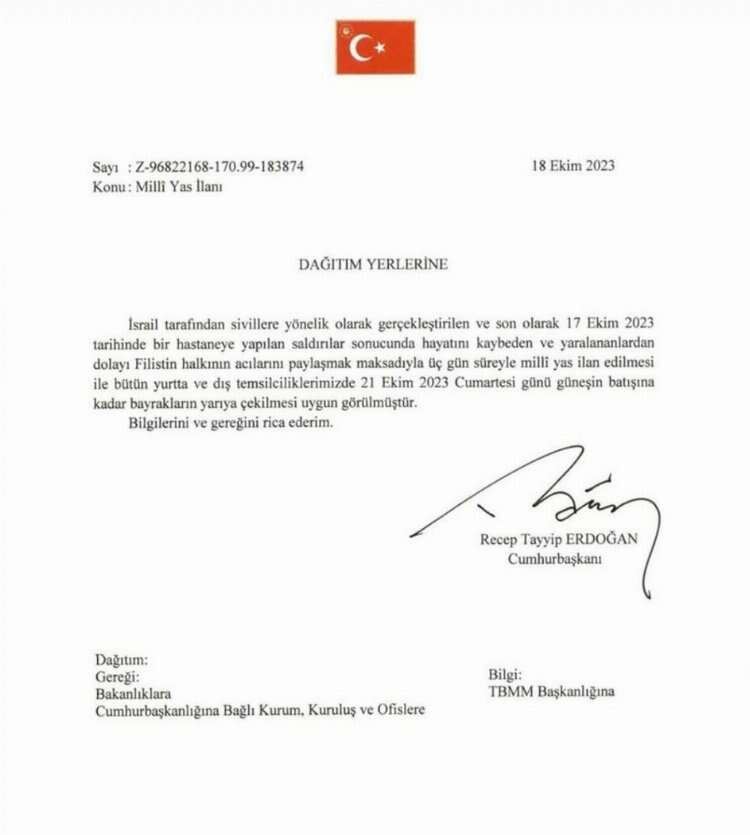 "Ülkemizde 3 günlük millî yas ilan edilmiştir" Cumhurbaşkanı Erdoğan yazılı açıklamasında şu ifadeleri kullandı: "Türkiye olarak Filistinli kardeşlerimizin yaşadığı büyük acıları yüreğimizde hissediyoruz.Çoğu çocuk ve masum sivillerden oluşan binlerce şehidimize duyduğumuz saygının bir gereği olarak ülkemizde 3 günlük millî yas ilan edilmiştir." Ayrıca Cumhurbaşkanı Erdoğan, 21 Ekim 2023 Cumartesi gününe kadar hem ülkemiz de hem de yurt dışı temsilciliklerinde bayraklarımızın yarıya indirileceğini açıkladı