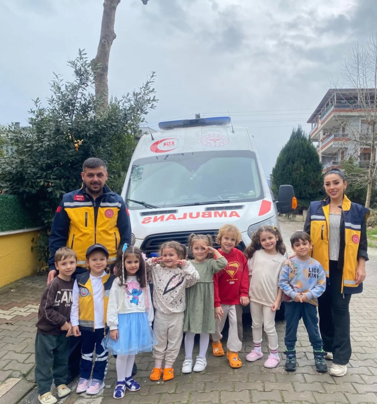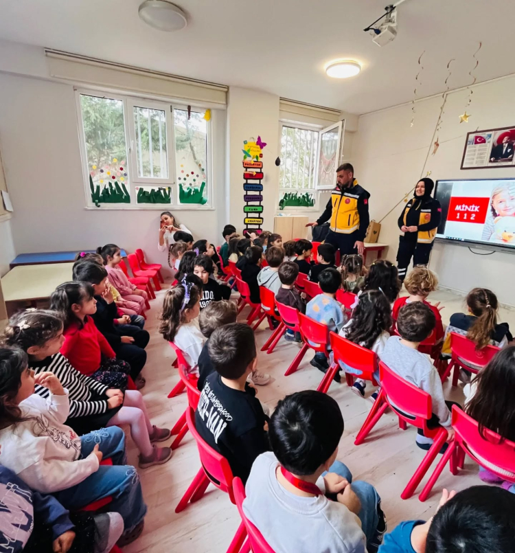 Etkinlik kapsamında 112 Acil Çağrı Hattı’nın hangi durumlarda aranması gerektiği, temel ilk yardımın önemi, küçük yaralanmalarda yapılması gerekenler ve acil sağlık ekiplerinin görev ve sorumlulukları hakkında bilgilendirme yapıldı. Minik öğrenciler, merak ettikleri soruları sorma fırsatı bulurken, gerçek hayatla bağlantılı uygulamalı anlatımlar sayesinde unutamayacakları bir deneyim yaşadı.