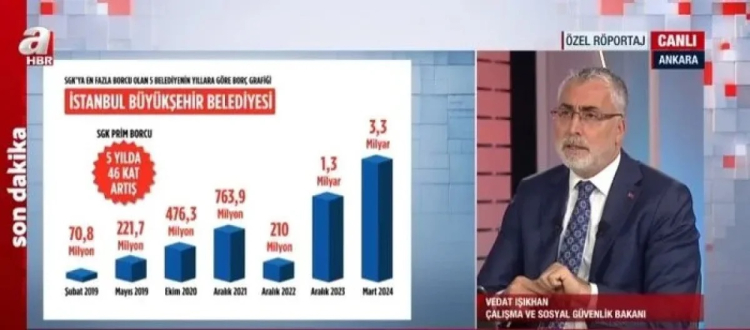 Işıkhan, İstanbul Büyükşehir Belediyesi'nin SGK'ye prim borcunun 5 yılda 46 kat artarak 3,3 milyar liraya ulaştığını belirterek İBB'nin bir şirketinin 800 milyon liralık prim borcunu yapılandırmak için başvurduğunu belirtti.