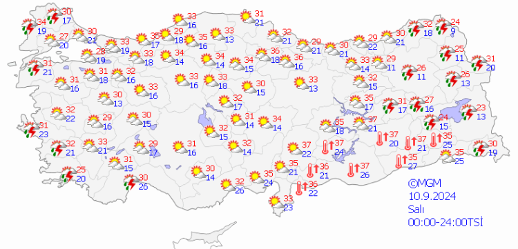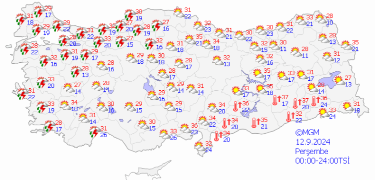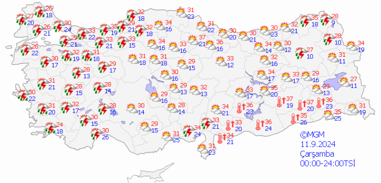 Meteoroloji Genel Müdürlüğü tarafından yapılan son tahminlere göre, Marmara’nın kuzeydoğusu, Orta ve Doğu Karadeniz, Doğu Anadolu’nun kuzeyi ile Zonguldak, Düzce, Sinop, Tunceli, Elazığ, Bingöl, Muş, Bitlis, Batman, Siirt çevreleri, Balıkesir'in kuzeyi, Muğla'nın doğusu, Antalya'nın iç kesimleri, Diyarbakır’ın doğusu ve Van’ın güney kesimlerinin yerel ve gök gürültülü sağanağın etkisinde olması bekleniyor.