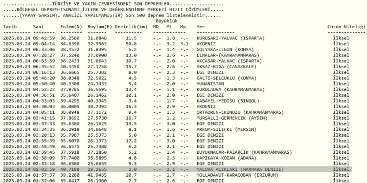 Boğaziçi Üniversitesi Kandilli Rasathanesi ve Deprem Araştırma Enstitüsü (KRDAE) Bölgesel Deprem-Tsunami İzleme Ve Değerlendirme Merkezi’nden (BDTİM) alınan bilgiye göre saat 02: 02 sularında Yalova açıkları Marmara Denizi’nde 2.1 şiddetinde deprem meydana geldi.