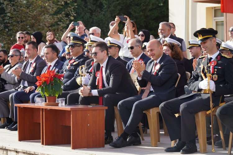 Törenlerin ardından Altınova Kaymakamı Halil İbrahim Kazar, Altınova Belediye Başkanı Dr. Metin Oral ve Garnizon Komutanlığı Temsilcisi tebrikleri kabul.