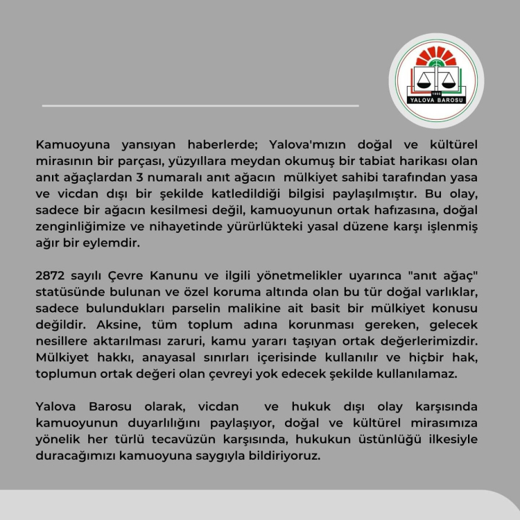 Yalova Barosu’ndan yapılan açıklamada “Kamuoyuna yansıyan haberlerde; Yalova'mızın doğal ve kültürel mirasının bir parçası, yüzyıllara meydan okumuş bir tabiat harikası olan anıt ağaçlardan 3 numaralı anıt ağacın mülkiyet sahibi tarafından yasa ve vicdan dışı bir şekilde katledildiği bilgisi paylaşılmıştır. Bu olay, sadece bir ağacın kesilmesi değil, kamuoyunun ortak hafızasına, doğal zenginliğimize ve nihayetinde yürürlükteki yasal düzene karşı işlenmiş ağır bir eylemdir” denildi.