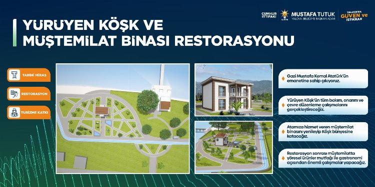 Yalova Belediye Başkanı Mustafa Tutuk ilin tarihine ve turizmine katkı sunacak önemli bir projeyi daha seçimden sonra hayata geçireceğinin müjdesini verdi. Ulu Önder Mustafa Kemal Atatürk’ün emaneti ve Yalova’nın simgesi Yürüyen Köşk’ün yan tarafında yer alan müştemilat binası Kültür ve Turizm Bakanlığı ile yapılan görüşmeler neticesinde Yalova Belediyesi’ne aktarılmıştı. Yalova Belediye Başkanı Mustafa Tutuk bu binanın aslına uygun bir şekilde restore edilmesini sağlamak adına düğmeye bastı. Bu doğrultuda hazırlanan proje ise kamuoyuna duyuruldu. Atatürk’ün mirasına sözde değil özde sahip çıkmanın güzel bir örneğini ortaya koyacaklarını dile getiren Tutuk, “Atamızın mirası olan ve ilimizin simgesine de dönüşen Yürüyen Köşk’ümüz var. Ulu Önder buradan tüm dünyaya yıllar önce bir çevrecilik dersi verdi. Burası o nedenle çok önemli. Biz Atatürk’e sözde değil özde sahip çıkıyoruz. Atatürk’e sahip çıkmak onun eserlerine de sahip çıkmak demektir. Birileri sadece Atatürk söylemi yaparken biz Atatürk’e onun eserlerine sahip çıkarak gerçek Atatürkçülük nasıl olurmuş bunun dersini de veriyoruz” dedi.