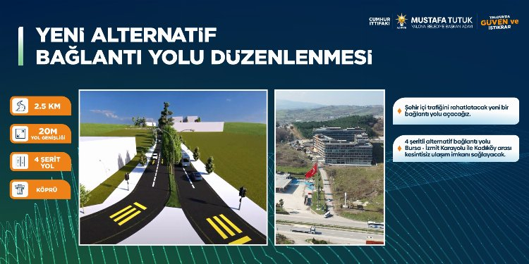 En az Güney Çevre Yolu kadar önemli bir diğer proje ise Yalova Belediyesi tarafından hayata geçirilecek olan alternatif bağlantı yolu düzenlemesi. Bu yol da tamamlandığında şehir içi trafik yükünün bir bölümünü kendine çekerek yoğunluğu azaltacak. Güzergah hakkında bilgi veren Başkan Tutuk, “Ulaşımla ilgili projelerimize devam ediyoruz. Yalova’nın ulaşım sorununu kökünden çözeceğiz. Bu çerçevede yeni alternatif bağlantı yolu düzenlemesi projemizi de göreve gelir gelmez hayata geçirmek istiyoruz. Hastanemizin güneyinde bulunan Şehit Muhsin Yazıcıoğlu Caddesi’ne bir alternatif bağlantı yolu yapacağız.