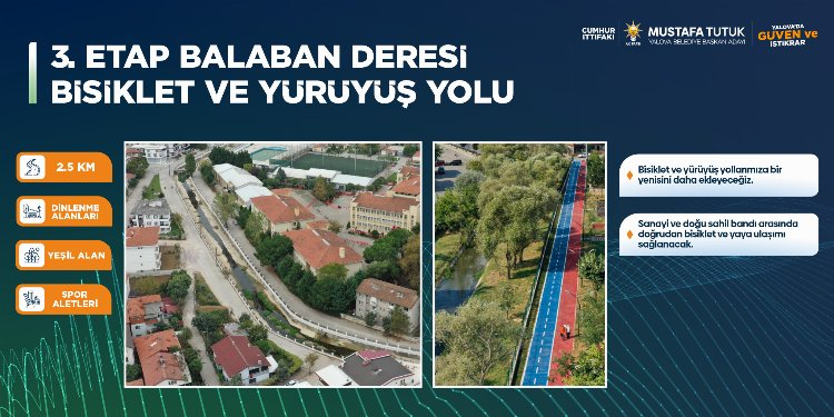 Projelerinden birisini de İzmit Karayolu yan yol düzenlemesi olacağına dikkat çeken Tutuk, “Bisiklet yolu ile Çiftlikköy ilçemizi ve Yalova’yı sahilden birleştirmiştik. Biz Çiftlikköy’ümüzü bisiklet yolu ile 2. Kez Yalova ile birleştireceğiz. Vatandaşlarımız ister bisikletli ve isterlerse yaya olarak Çiftlikköy ilçemize güvenli bir şekilde ulaşacaklar. 2,5 kilometre uzunluğa sahip olacak bu yolda yeşil alanlar da yer alacak” diye konuştu.