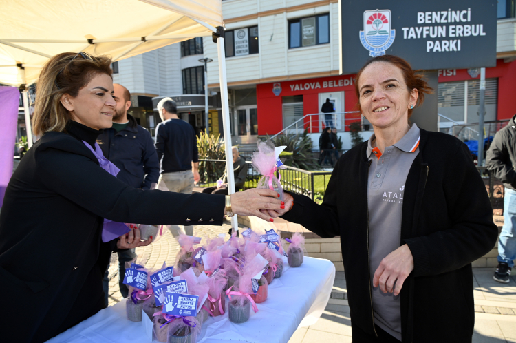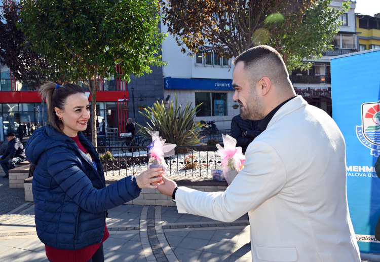 Yalova Belediye Başkanı Mehmet Gürel, Uğur Mumcu Kültür Merkezi önünde kurulan stantta kadınlara çiçek takdim ederek bu özel günde dayanışma mesajı verdi.