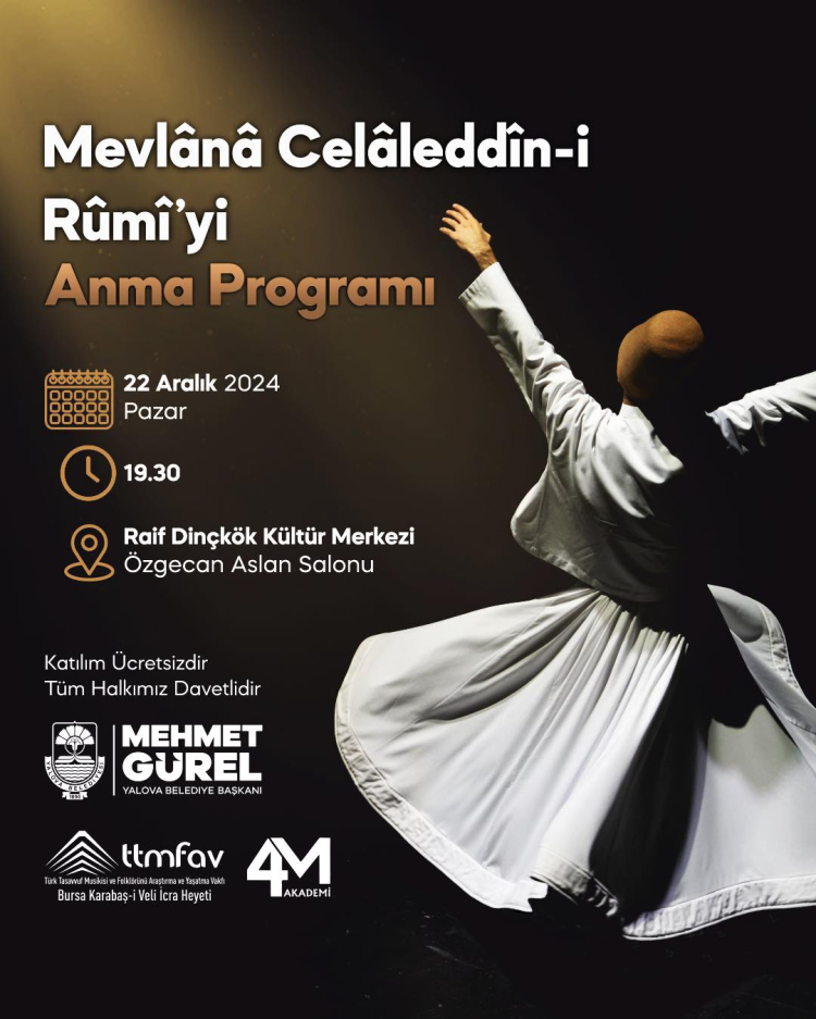 Yalova Belediyesi, TTMFAV Bursa Karabaş-ı Veli İcra Heyeti ve 4M Akademi iş birliğiyle, büyük mutasavvıf ve şair Mevlânâ Celâleddin-i Rûmî’nin 751. vuslat yıl dönümünü anmak için özel bir etkinlik düzenliyor.