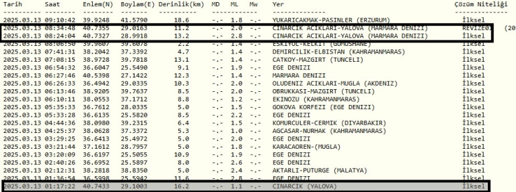 Yurdun dört bir yanından korkutan deprem haberleri gelmeye devam ediyor. Son sarsıntılar Yalova’nın Çınarcık ilçesinde kaydedildi. Gece boyunca meydana gelen 3 ayrı depremlerle ilgili ilk veriler Kandilli rasathanesi tarafından duyuruldu.Yalova’nın Çınarcık ilçesinde art arda üç deprem meydana geldi. 1.1, 2.8 ve 2.0 büyüklüğündeki sarsıntılar hissedilirken, herhangi bir can ve mal kaybı yaşanmadı