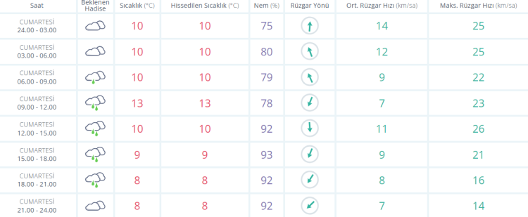 15.00-18.00 saatleri arasında yağmur sürecek ve hava sıcaklığı 9°C’ye inecek. Bu saatlerde nem oranı %93 seviyesinde olacak. Rüzgar ise ortalama 9 km/sa hızında esecek.