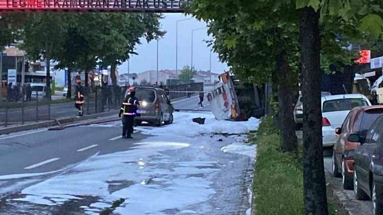 Kocaeli’nin Gölcük ilçesinde Yalova’ya doğru seyir halinde ilerleyen benzin yüklü tanker, üst geçit köprüsüne ve 3 araca çarparak devrildi. Kaza sonrası tankerde bulunan benzin yola saçıldı. Patlama riskine karşı yolun iki şeridi trafiğe kapatılırken çevredeki evler de tahliye edildi.