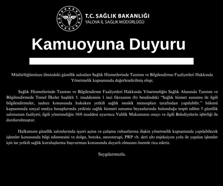 Konuyla ilgili açıklamalarda bulunan Yalova İl Sağlık Müdürlüğü, “Müdürlüğümüzce ilimizdeki güzellik salonları Sağlık Hizmetlerinde Tanıtım ve Bilgilendirme Faaliyetleri Hakkında Yönetmelik kapsamında değerlendirilmiş olup, Sağlık Hizmetlerinde Tanıtım ve Bilgilendirme Faaliyetleri Hakkında Yönetmeliğin Sağlık Alanında Tanıtım ve Bilgilendirmede Temel İlkeler başlıklı 5. maddesinin 1 inci fıkrasının (b) bendindeki “Sağlık hizmet sunumu ile ilgili bilgilendirmeler, sadece konusunda hukuken yetkili sağlık meslek mensupları tarafından yapılabilir." hükmü kapsamında sosyal medya hesaplarında yetkisiz sağlık hizmeti sunumu beyanlarında bulunduğu tespit edilen 5 güzellik salonunun faaliyeti; ilgili yönetmeliğin 10/6 maddesi uyarınca Valilik Makamının onayı ve ilgili Belediyelerin işbirliği ile durdurulmuştur. Halkımızın güzellik salonlarında işyeri açma ve çalışma ruhsatlarına ilişkin yönetmelik kapsamında yapılabilecek işlemler konusunda bilgi edinmesini ve dolgu, botoks, mezoterapi, PRP vb. deri altı enjeksiyon yolu ile yapılan işlemler için ise yetkili sağlık kuruluşlarına başvurması konusunda duyarlı olmasını önemle rica ederiz” denildi.