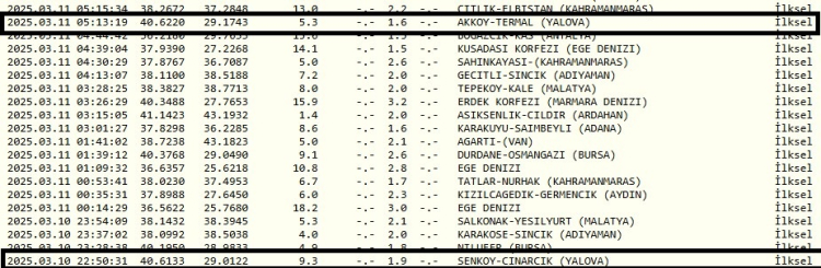 Öte yandan Yalova açıklarında da gece saatlerinde art arda iki deprem meydana geldi. Saat 22: 50 sularında Çınarcık’ın Şenköy mevkiinde meydana gelen depremin şiddeti 1,9 olarak kaydedildi. Ardından Termal’in Akköy açıklarında da 1,6 şiddetinde bir deprem daha meydana geldi.